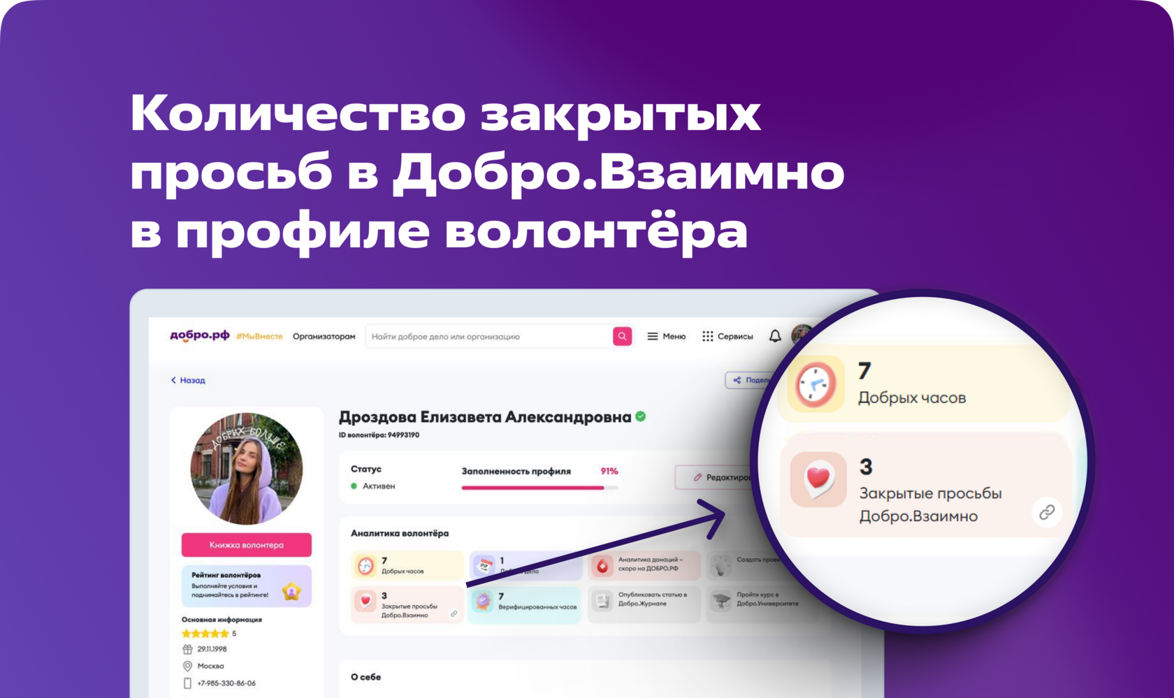 Также мы обновили дизайн аналитики пользователя и добавили другой один важный показатель, который скоро будет учитываться в профиле волонтёра.