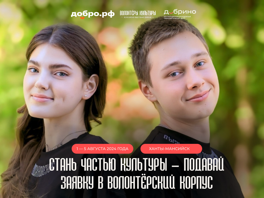 С 1 по 5 августа 2024 года в Ханты-Мансийске пройдет Всероссийский форум волонтёров культуры. Проведут его Всероссийское общественное движение добровольцев в сфере культуры «Волонтёры культуры» совместно с Круглогодичным образовательным молодежным центром «Добрино».