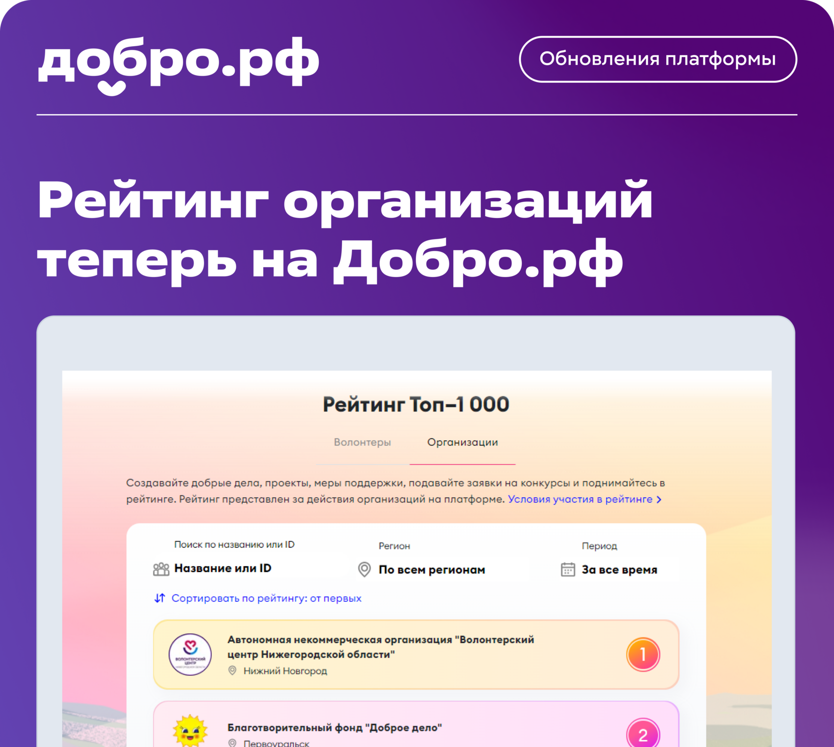 Вы точно этого ждали! На платформе появился рейтинг организаций. В нём любой пользователь сможет найти нужную организацию по ID, сортировать список от последнего места к первому и обратно, а также фильтровать его по названию, региону и году.