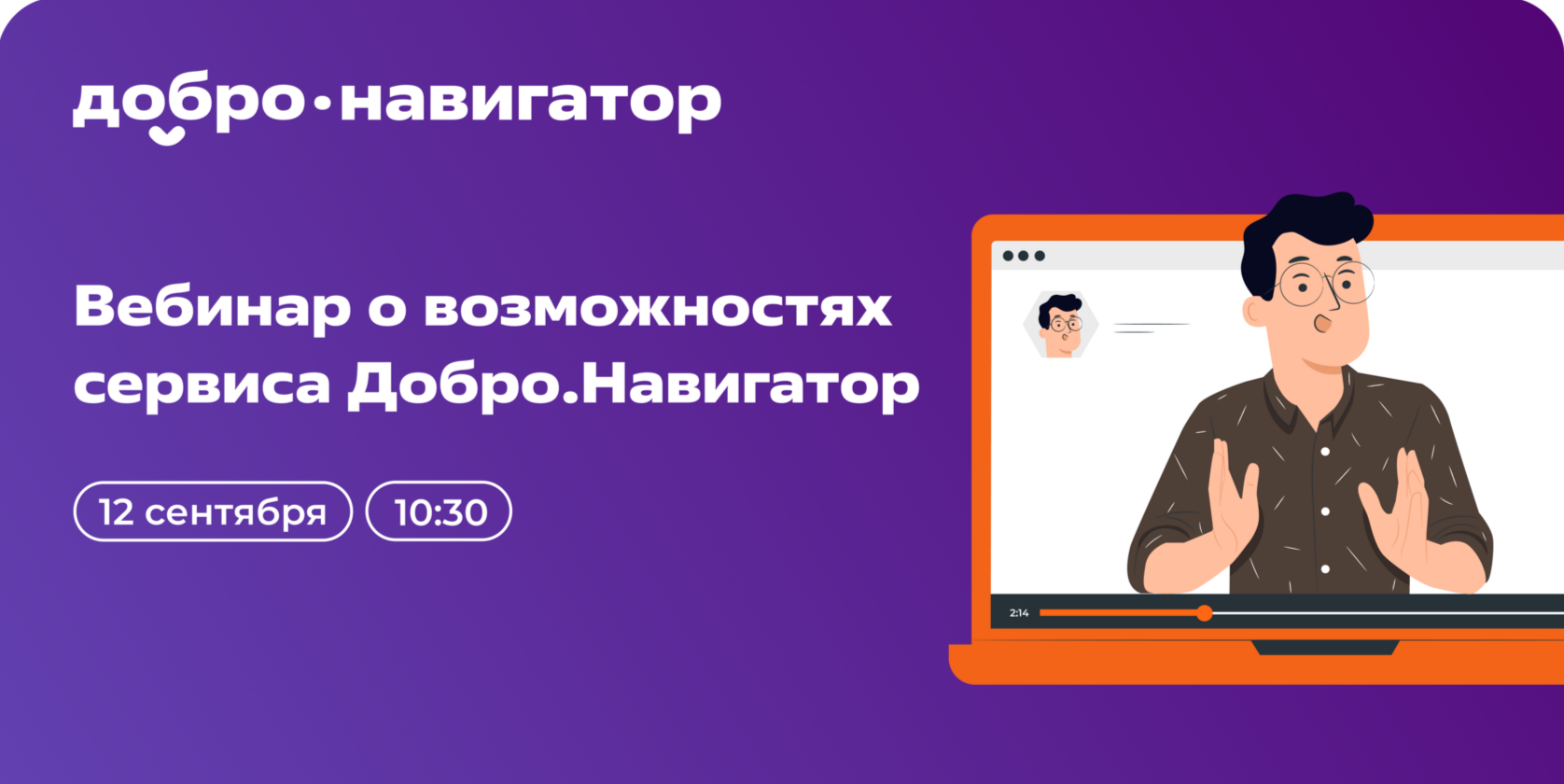 Вы успешно зарегистрировались на вебинар о возможностях сервиса Добро.Навигатор, который пройдет 12 сентября в 10:30 по московскому времени.