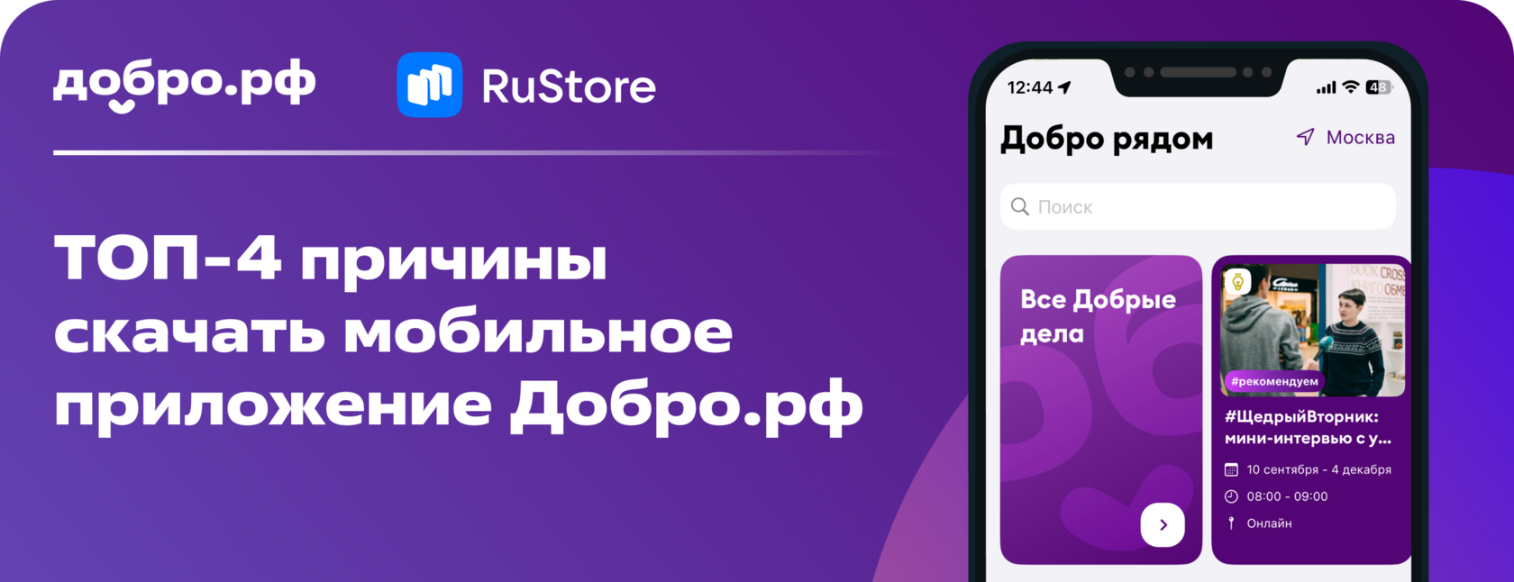 Наше приложение всегда доступно в RuStore — официальном магазине приложений для Android. С его помощью вы можете легко скачать или обновить Добро.рф — это безопасно и удобно. | | | | | Вы получили это письмо, так как зарегистрировались на платформе ДОБРО.РФ Управлять уведомлениями вы можете в настройках профиля | Если вы хотите отказаться от рассылки, нажмите здесь © 2024, ДОБРО.РФ | | | |