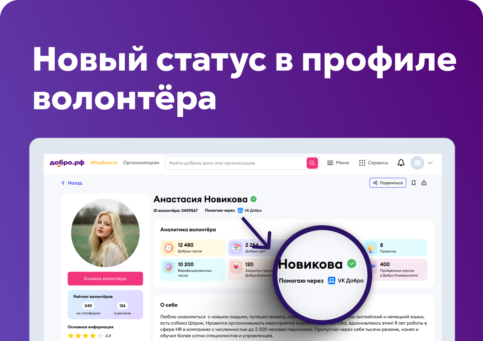 получат специальный статус в профиле волонтёра. Значок «Помогаю через VK Добро» мы будем