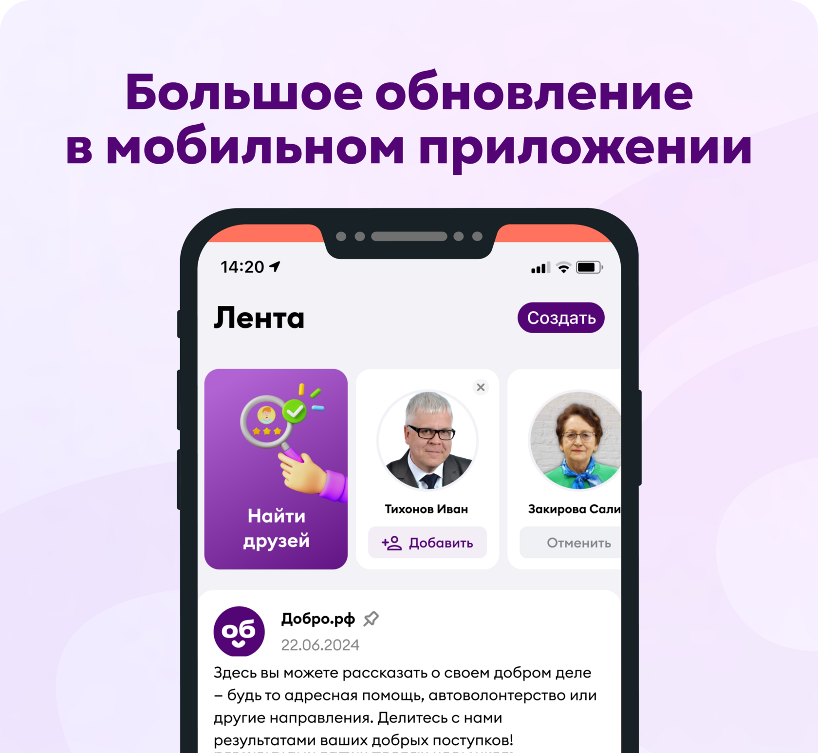 | В мобильном приложении Добро.pф – большое обновление! В нём появилась Лента, в которой вы сможете рассказать другим о повседневных добрых делах.