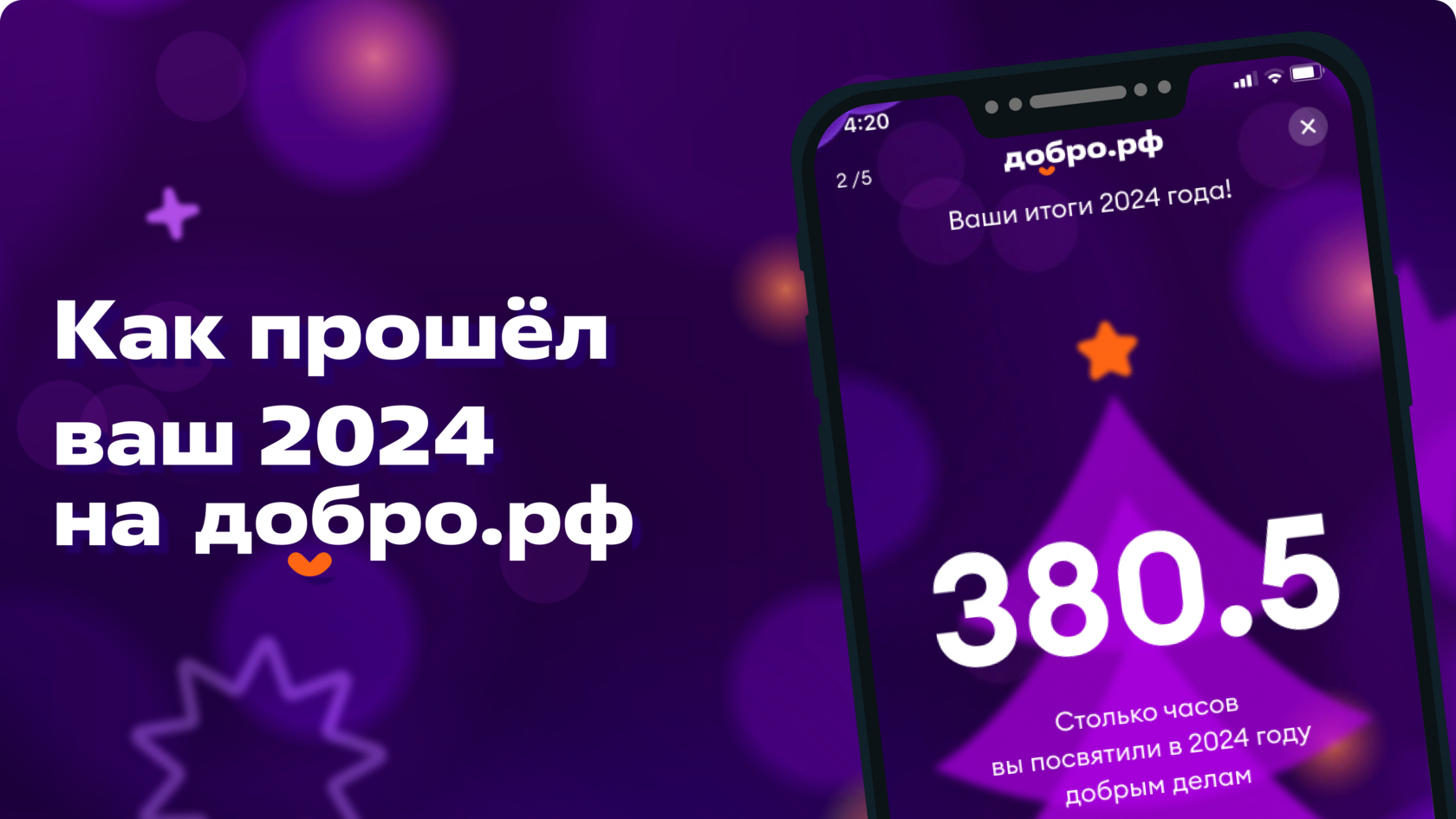 | Хотите узнать, как прошёл ваш 2024-й с платформой Добро.рф? Мы посчитали всё за вас и добавили персональные итоги года пользователей платформы в мобильное приложение Добро.pф.