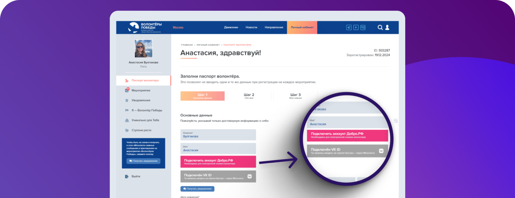 Чтобы перенести волонтёрские часы с сайта Волонтёров Победы на Добро.pф:- Зайдите в личный кабинет на сайте Волонтёров Победы