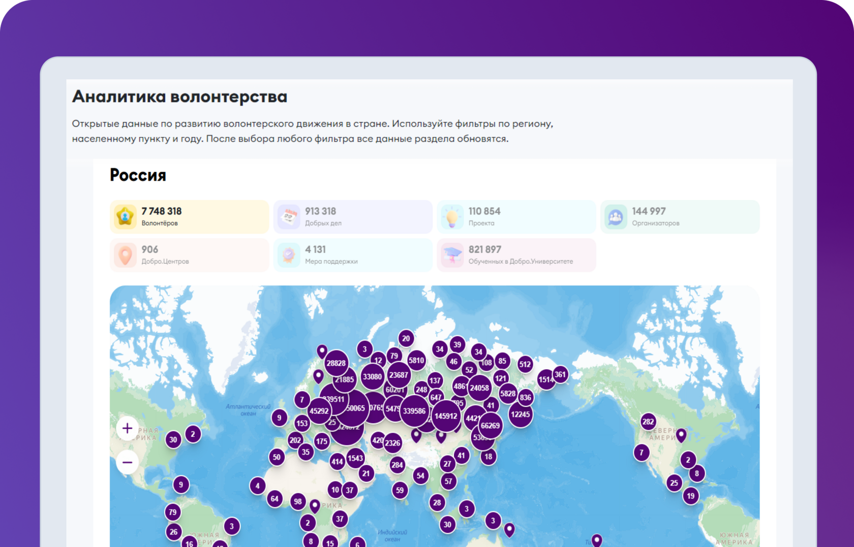 Для этого на платформе Добро.pф у нас есть специальный раздел «Аналитика волонтёрства». В нём в режиме реального времени обновляются данные по количеству организаторов добрых дел, волонтёров, проектов и вакансий, открытых Добро.Центров, обученных в Добро.Университете и мер поддержки из Добро.Навигатора.